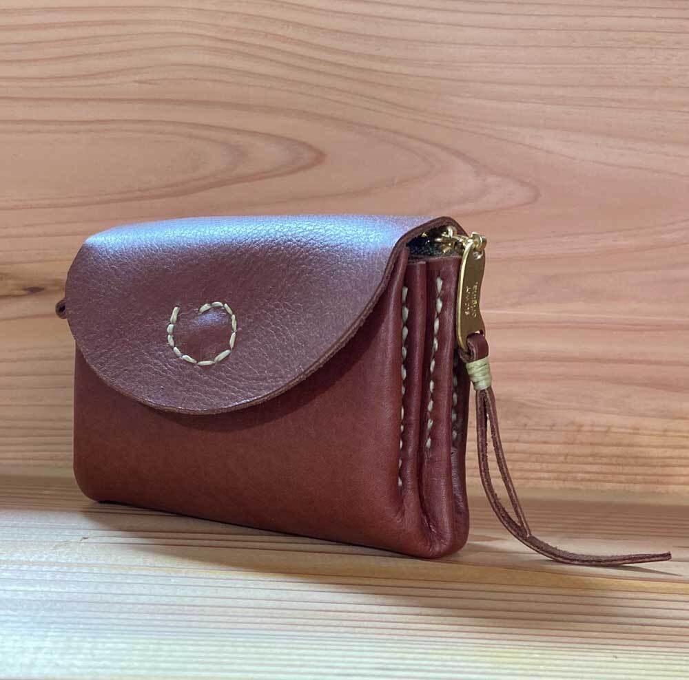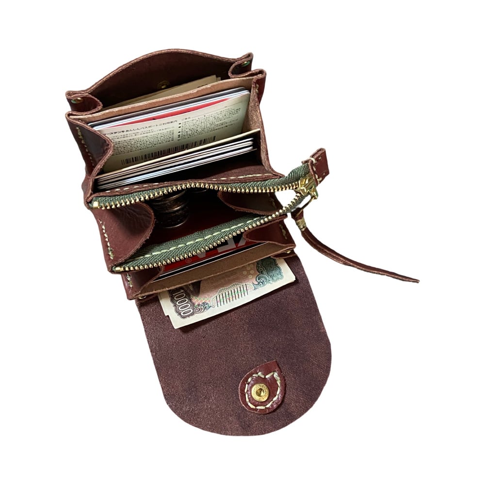 外側は継ぎ目のない1枚革、シニュー糸使用の無骨なハンドステッチ、愛嬌のあるフォルム、たくさん入れてまるまると太らせることでより愛着の湧くお財布です。