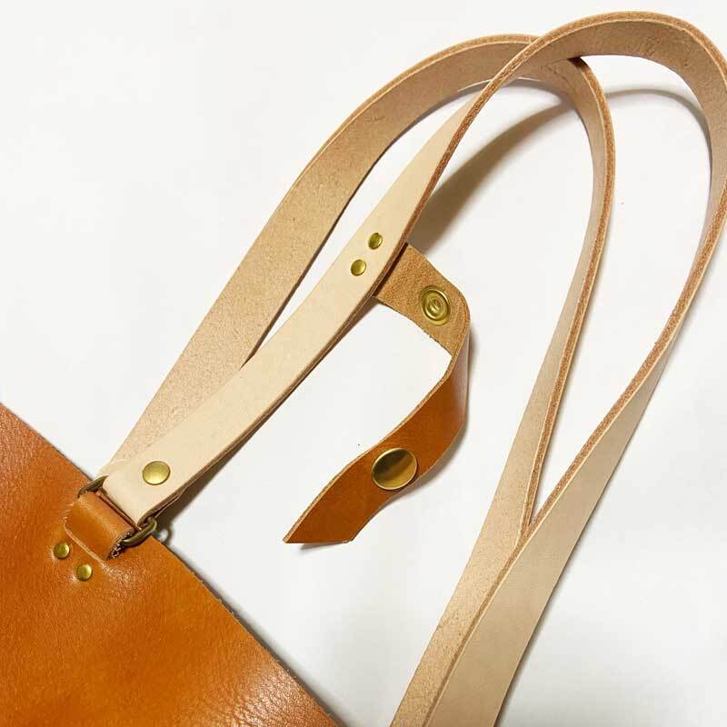 (素材)牛革。金具は真鍮製。糸は手縫い専用のシニュー糸を使っているので、不揃い感のある温もりのあるステッチになります。