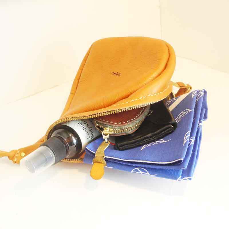 本革を曲線のパターンに裁断し、手縫いで縫い合わせた手提げポーチです。